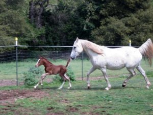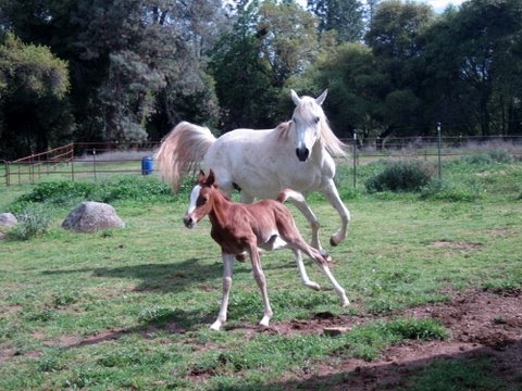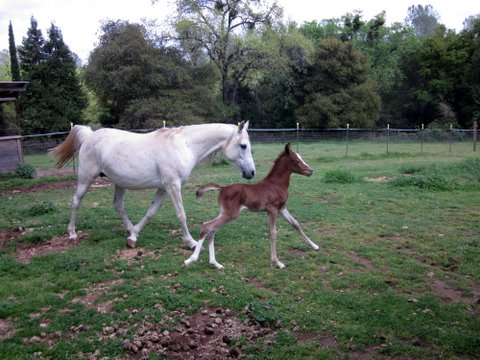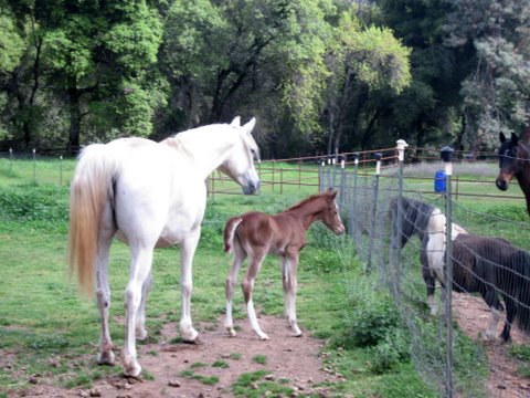Yep, the filly went outside for the first time this afternoon! After I got home and tended Blaze and scrubbed out the trailer it was officially time for filly’s first outing! Josh led the mare and I haltered and butt roped the baby and just sort of cradled her in my arms and walked with her that way to the pasture. She was surprisingly iffy about the whole thing and let mom walk on away from her without moving an inch away from the stall! I suppose it is the only place she has ever been though. I clicked to her and helped her with a little pressure from behind and then she unlocked and started trotting after mom! So I was kind of running alongside still cradling but letting her do it. We got to the paddock and it was time to let them go. They actually stood still for a few minutes just sort of getting bearings and mom was pinning her ears and telling the geldings to go far far away. The mini was absolutely pressed against the fence trying to smell the baby and Blaze seemed much less impressed. Blaze was surprisingly cool about the situation, actually. I know he heard the baby from the pasture outside the stall since she was born so I don’t think he was hugely surprising to see her..maybe? I dunno, he stayed pretty mellow though. The mini was fascinated, maybe he thinks the filly is another mini, maybe his long lost lover from his last residence. Sheza finally started running around and mom was right on her heels. They had a great run and I was snapping photos and Josh videoing.