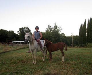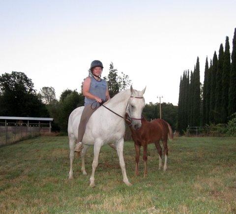 That’s right, I’m really starting to looooooove my momma mare, Desire. She is so funny and has a very interesting attitude and personality. She is calm and quiet about things I think she might potentially be bothered by (jumping on her bareback, having the baby spazzing around her with the lead rope when I pony, etc) but gets nervous about random things, likes the hose. She is going on 15 this yr and has been an endurance horse so I know she has had endless hose baths and she always lets me spray her, but the sight of the hose still makes go into her ‘tense stance’ which is really funny, she sort of parks out and eyes it like its going to eat her, but stands perfectly still and lets me do what I’m going to do. Trailwise, I’ve only ridden her on the little loop inside our big pasture and she definitely eyeballed some things and snorted a little but hasn’t shown any real spooks. She has a rub from my stupid girth (ordered the mohair string girth and some wooly covers for my stirrup leathers today) so I decided to ride her bareback this evening. I was a little hesitant to jump on her bareback, just because it was the first time with her and since my accident that initial moment of swinging up on a horse (aside from Blaze) makes me a tiny bit anxious. I used my mounting block and had to do the tiniest hop up to get on her and she stood like a rock and was very unimpressed. Which was great! The filly started trotting after us while she was at liberty, though not all the time, and she seems to be getting the idea about ponying along beside us, even without a lead rope. For some reason Sheza decided as of last night and today that when I get on Desire (this is holding Sheza’s lead rope, to practice ponying) its very terrifying and she needs to freak out, which makes mounting safely a little bit difficult. I don’t have anyone to hand me the rope once I’m mounted soooo. I worked on it this evening, first I just stood on top of the mounting block and let Sheza get used to that, then I leaned forward and acted like I was about to mount and the filly spazzed backwards like I had hit her or something. Very weird. Once she stopped doing that I finally eased onto momma’s back without any more drama. Who knows what little whispers in Sheza’s ears tell her that these things are scary! She seems to get over it and learn everything quite quickly though so I am just taking everything in stride and so far really haven’t had any issues. The most frustrating thing so far in my first-foal experience was Sheza pulling her touch-me-not shenanigans last week, but she got over that and it really wasn’t so bad. Overall I am enjoying it immensely, and really falling in love with my girls!