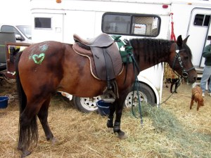 I got about 2 hours of sleep that night, there was a lot of action at ride manager headquarters into the wee hours of the morning and I started to get a headache around midnight but luckily it was curtailed by a dose of Excedrin I dug out of my first aid kit in the truck. No sleep I can deal with, a migraine on ride morning I cannot deal with. The 30 started at 7 am but I was sick of lying around awake and needed to move my pommel bag and gear onto the Free n’ Easy so I was up early messing with all that. I also gave into my longtime desire to bedazzle a horse and painted hearts in green glitter on Blaze’s flanks π They weren’t writing numbers on the horses so I figured I would spruce it up back there and we got lots of compliments on the glitter all day. E, A, and I set off from the start a couple minutes after 7 and were at the back of the pack with only two other riders left starting behind us which was fine since it was A’s first ride and we were planning to take our time with all the steep hills.