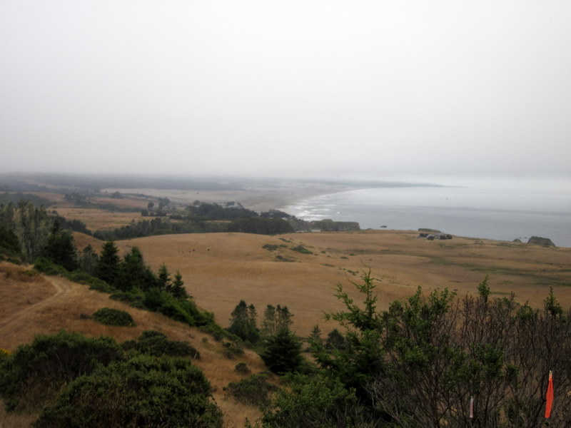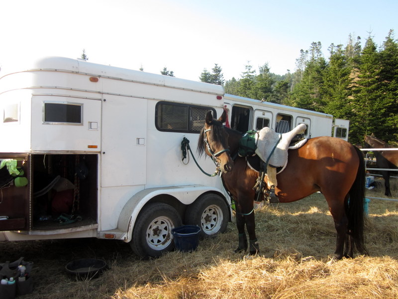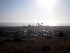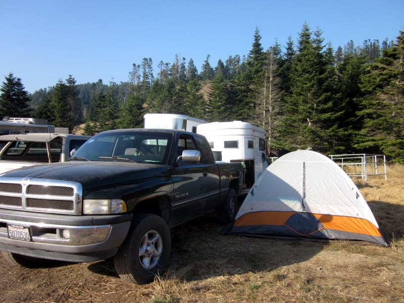 To begin from the beginning: Blaze, Georgia, and I set off Friday morning and a relatively uneventful, if long, drive over to the coast. It takes 4 hours in a car, took me about 6 hours all told. I had to make a couple of stops along the way (Wal-mart for a new Igloo marine cooler since ours finally gave up the ghost, gas, food supplies etc) but there was also road construction, a car accident on Hwy 20, and just when I was really on edge and ready to get to ride camp already the Skunk Train pulled through Fort Bragg. Hwy 20 between Willits and Fort Bragg was a long slow stretch as well, I don’t know how loaded log trucks fly through that stretch so quickly but then they don’t have live cargo in the back so that probably helps. I pulled over at least 10 times and reminded myself that Friday is really not the day to be getting to the coast as there is endless traffic. We finally got into ride camp around 2:30 in the afternoon and it was already packed with rigs of all sizes. They had it pretty well organized with signage directing large, medium, and small rigs to go to their respective spots.