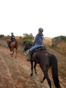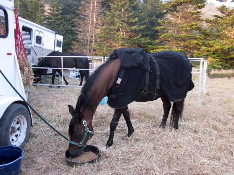 I slept surprisingly well Friday night, the thick flannel-lined sleeping bag that is usually my nemesis at inland rides was so incredibly cozy on the chilly foggy coast! The registration table and general center of operations was behind the barn right across from where we were camping so there was some late night commotion and chatting going on but I fell asleep pretty easily and only woke up once when some mystery bird was calling reptitively and obnoxiously from about midnight to 1 am. Eventually that stopped or maybe I just fell asleep through the rest of it and I was still in my cozy sleeping bag at 7 am Saturday! That’s unheard of for me as I usually sleep horribly at rides and am ready to give up attempting to sleep around 5 am. I heard the head of volunteers (a lady I used to ride with when I first got into endurance as a teenager and wife of my first-ever farrier) calling out looking for E so she could lead the brigade of vets and volunteers out to the vet check meadow so figured that was my cue to be getting up in a hurry. We were all rousted and dressed in a couple of minutes and packed into E’s truck with a couple of vets following behind. The vet check meadow was a spot we often used as a lunch rest for guests when I was a trail guide so once again I was back on familiar territory. E was a vet scribe all morning and I did P&Rs with A manning the official P&R clock. It was pretty funny being on the other side of things, I had never volunteered at an endurance ride before but having ridden at plenty I knew the riders would be taking their P&Rs pretty seriously and we better be on our game. I certainly knew how to take the pulse reading with a stethescope and watch but was a little nervous that I get it all right and do so quickly. I couldn’t even find the heartbeat on the first horse (now you’re all rolling your eyes but after taking at least 100 pulses on Saturday there were some very very quiet heart beats and some very loud obvious ones) and my heart was in my mouth for a minute as the head-of-the-pack 75 miler rider was standing (im)patiently at his horse’s head but I quickly got back on track and got him through and from there things got easier. There was some general math issues when adding the 30 minute hold time to their pulse down time which was pretty funny as well. The pressure of getting the riders through quickly got to all of us at one time or another but overall it went pretty smoothly. It truly was all about confidence, if you swaggered up to a horse and took the pulse authoratatively there were no issues even if it took you a minute (not literally) to get a good pulse reading; it was the more timid, nervous approach to doing it that seemed to irk people. There were a couple of riders who were kind of obnoxious when things didn’t go as speedily as they wanted but to them I say without volunteers there is no ride, so take a chill pill or six. There’s no big cash prize waiting for you at the finish line and the extra 5 seconds it takes a good hearted volunteer to do some math on your vet card isn’t the end of the world. We finished up with all the riders around 11 and headed back to camp to take P&Rs for the 1 hr lunch holds, then around 2 E was being dispatched to break glow sticks for the 75 milers who would be riding after dark. I’m always up for riding some horse somewhere so I got to tag along on the ride manager’s fun mare who has 3,000+ race miles. We flew along the 15 mile loop from one glow stick to another and had lots of fun and were back in camp by 5, then it was time to vet in our own horses for Sunday. Blaze gave me a good laugh when we vetted in, he did his best arch-necked, snarl-nosed, fire breathing mini endurance monster trot out and even the vet was chuckling at all that attitude packed into Blaze’s 14 hand frame. Blaze’s motto is definitely “I am small but I am MIGHTY!” We vetted in with all As and then went to the ride dinner with E so she could eat and put together a used Free n’ Easy saddle she had for sale that I wanted to try out on Blaze. I know I know, don’t try new gear on rides but I have been having an endless fruitless battle with my saddle the last couple of weeks that ended in the conclusion that one of the panels is broken. I went into this ride with a sort of blind faith that it would work out somehow as I really wasn’t keen on using my saddle on him for the race itself since it already put one wear mark on Blaze’s back. E was recently in England at the Free n’ Easy factory (or whatever one calls it) and built her own saddle from scratch so she tore the used saddle she had apart and custom fit it to Blaze’s back Saturday night, bless her heart. I did a test ride in it as it got dark and the panels left perfect even sweat marks on his back. After the saddle fitting E was well and truly beat so she headed to bed and A, A’s dad, and I headed to the Purple Rose Mexican restaurant at the edge of town so we could get inside and be warm while we ate. It was very chilly and foggy Saturday evening and the promise of a warm restaurant was too lovely to resist. The food hit the spot and we all headed off to bed as soon as we got back.