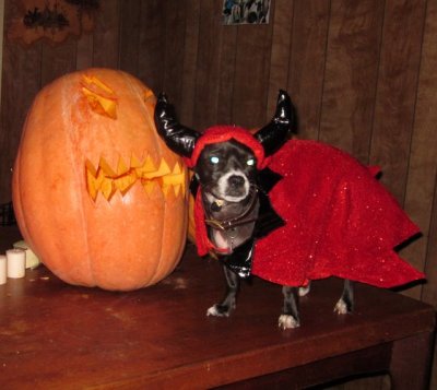 1. LOL Georgia actually was into the costumes, she was wagging her little rat tail a lot. The wiener dog on the other hand was in full rigid sulk mode, he was not happy.