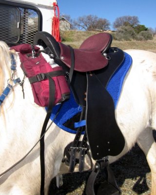 Comfort wise, the memory foam-esque seat was as lovely to sit in as I hoped it would be. The lower part of the fenders where it curls around your shin were predictably new-saddle stiff which put more torque on my bad ankle than I like, but the saddle does need to be broken in. The western saddle I’ve been using on her was the same–I borrowed it with only 4 rides on it and it started out stiff but now curls around the leg without putting a torsion on my ankle. I put the stirrups it came with on the saddle, though they are heavy and clanky they have really thick nice padding. It’s so nice to have loads of D rings to attach things to again and it was awesome how perfectly the burgundy saddle seat matched my wine&blue colored tack. I scored a royal blue cantle pack from The Distance Depot to use for rides when I need to carry more water and it matches the blue saddle pad pretty darn well. I’m so gleeful about matching color tack, I could never go back to plain old leather!