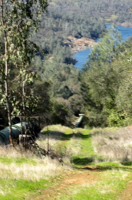 We galloped from the bottom of the hill pictured below, way down where the pipe disappears, to the top. Desire was seriously huffing and puffing, but she did it. It was fuunnnn!