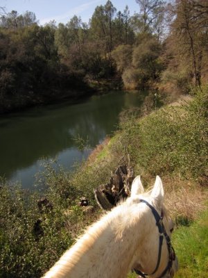 Miss D and I headed out along Saddle Dam for a warm up mile while N tacked up. A big group of 6 or 8 riders (including the boot lady) were heading out for the horse camp loop as I was coming back in to rejoin N, but Desire jogged on by without any concern. We joined up with N and headed off for the Visitor Center/ridge trail as usual. At the first water trough not far out from the trailers, N’s mare stopped and rubbed her head on the trough but didn’t drink, so we continued, walking down a little hill and then starting back up a short steep incline. I started to trot up the incline as we usually do but heard N saying “Stop!” I turned and didn’t see anything but N said Willow had reared. Things seemed to be okay so we started to walk on but I heard N cry out again and turned to see Willow rearing and twisting to the right. She kept turning and turning to the right and half rearing, finally N bailed but then Willow kept turning and knocked her whole body in N a couple of times as she tried to catch her. It all happened so quickly and was so hard to tell at first what was wrong. Willow finally stopped and N immediately saw that one of her rein stoppers was gone and the martingale ring had slip up and become stuck on the rein clip, thereby effectively cranking Willow’s head to the right and keeping her turning in frantic circles to try to relieve the pressure. It wasn’t the mare’s fault, but resulted in a serious crack to N’s head plus being body swiped by her horse 3 or 4 times. It could have been worse but it wasn’t great! N thought her nose might be broken but it wasn’t bleeding and she decided to lead Willow on foot for a minute and see how she felt. We got almost to the foot of the long hill up to the Visitor’s Center and then N told me to go on ahead and ride and she would hang out with Willow, maybe ride a little, but wasn’t feeling she would be able to continue at speed. I felt really bad and offered to ride with her back to the trailer but she insisted she was okay. There were lots of people out on the trails today which made me feel a little better that she would find help if she needed it, but I was still a little worried about her for the remainder of the ride.