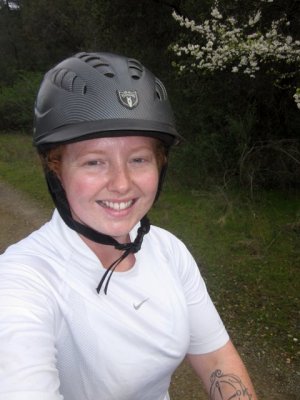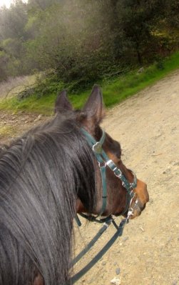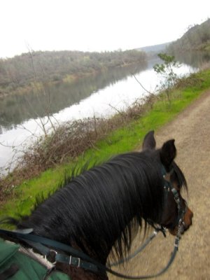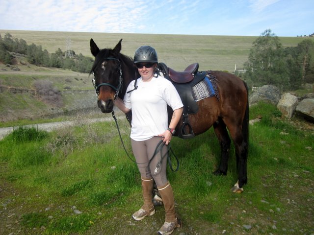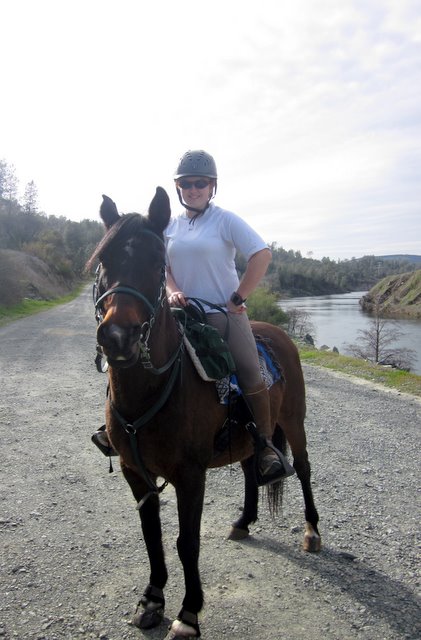 My husband took a few cool pics of us. In the top one the big “hill” behind us is Oroville Dam. Below that I rode down the road a little ways with J to where he heads off to fish and Blaze was snorty snort snort at everything and standing on his Arab tippy toes, not wanting to go forward. There is a mountain lion in that area (that’s the spot our lab, Tady, ran off up a hill and came back with claw marks down his chest and shoulder) and we wondered if he smelled something because he was NOT pleased and it’s not like Blaze to make a big fuss over nothing. Still, cool photos: