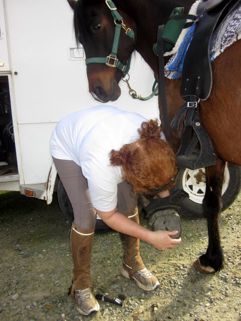 We wandered back to the trailer around 5 and I held my breath as I untacked the Blazer–and discovered almost perfectly even sweat marks! There was a bit of ruffed hair at the shoulder areas but that seemed to be more saddle fit than anything else, and I had changed my shimming for today as I didn’t think I had adequately thick shims at the hollows behind his shark withers. Yeah, he is a special shaped horse. But anyhoo my cheesy saddle pad improvisation worked a charm!