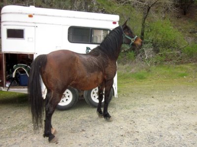 My husband had a great spontaneous idea for us to throw a horse in the trailer, his fishing rods in the Bomber, and head down to the lake together. I decided Blaze was overdue for some trail time and loaded him up. Bless his heart, I must mention that after 6 months without being in the trailer (time off after last season’s saddle fit issues, been riding him from home) he hopped right into the trailer without hesitation. He was sweaty and had nervous cow pie poops in the trailer, like he used to when I first got him, but I know he’ll chill out with a few more times out.