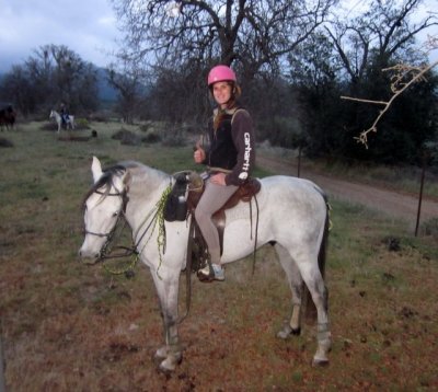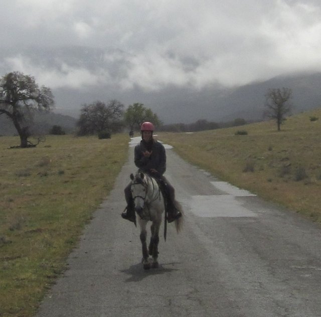We crossed another dry river bed and not long after under a tunnel under the highway that was just higher than our heads when mounted. It was a little unnerving jigging along under there with your head tucked down just to be sure, but it was a short tunnel and no harm done. A few miles later we got to do our trot-by poses for Lynn Glazer, though A and I both ended up cantering by. I’ve never had a cantering ride photo, thought it was worth a shot! We dragged into camp pretty soggy, cold, and hungry for the lunch stop and vetted right through. The horses got their coolers and blankets back on right away and Desire drank but didn’t eat very much, she had a few bites but mostly was napping.