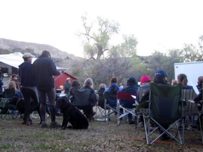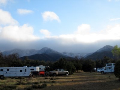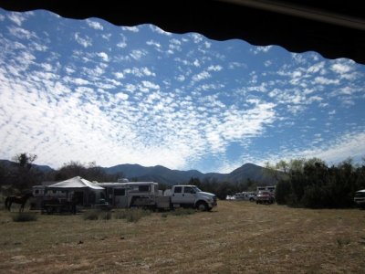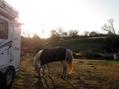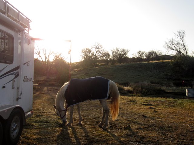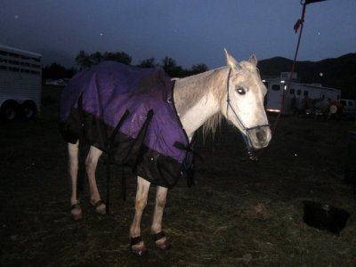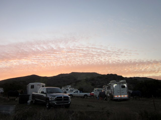 It was about a 10 hour drive to camp near New Cuyama, but you could have fooled me, the drive went by really quickly even as a passenger. We stopped and let the horses out to graze and relax, made a fuel stop and a food/water tank filler stop (“Oh yes, we’re just filling a few little buckets” I assured the gas station guy when I asked to use the spigot and hose outside the station.) And then we were there! We pulled into ride camp at about 11 pm Wednesday night and parked just inside and to the right of one of the gates, figuring we’d find a better spot in the morning. The horses went out on their Hi-Ties in blankets with yet more food –Desire ate non stop the whole trailer ride and was round as a little piglet when we got there!– and we crawled into our beds.