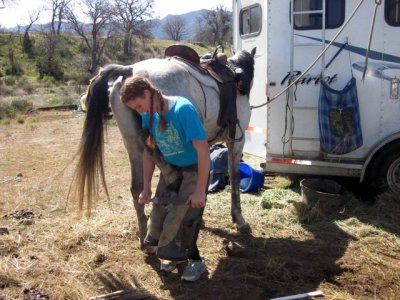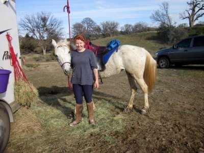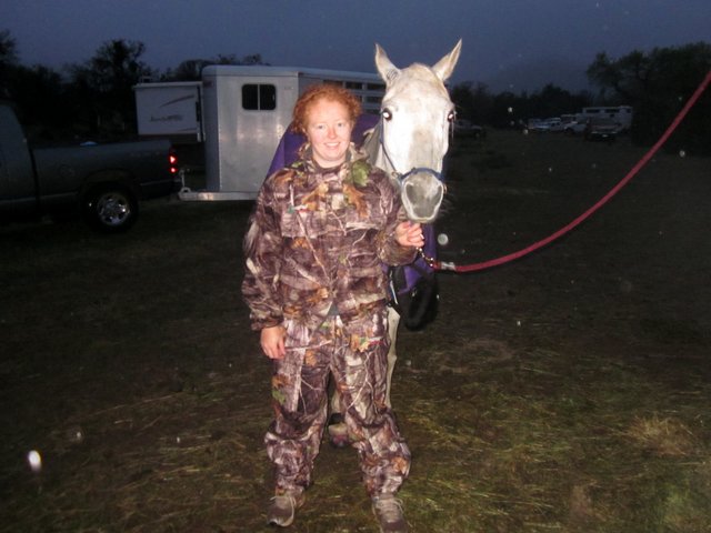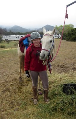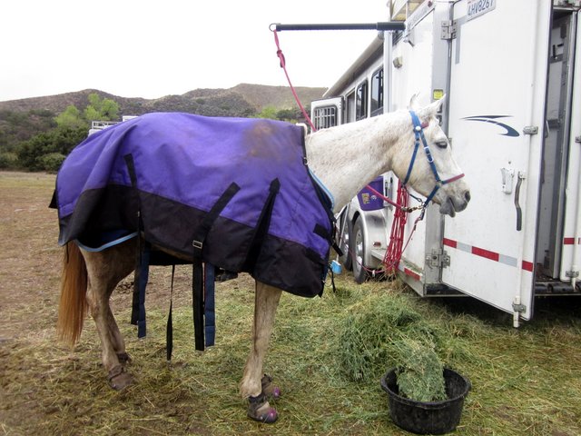 We were both too tired to even bother showering Friday night and were in bed in no time. I still had a nagging light head ache and it persisted into Saturday, but I slept pretty well and was up to see A off and take Desire for a walk, as Desire was *pissed* to not be heading out with the other horses and was going bananas on her Hi-tie. She calmed down after a long walk and a drink at the trough and then was pretty mellow back at the trailer so I crawled back into bed. It was foggy and really cold in the morning without a horse pulling your arms out of your sockets! I bundled up and went back to bed then woke up abruptly a while later to see blue skies and a hot sun, so I scrambled outside shedding layers as I went, and pulled Desire’s blanket off. She was a little sweaty underneath and I sponged her and cleaned her up some more from the ride. As I was brushing her out A came in for her in-camp lunch stop.