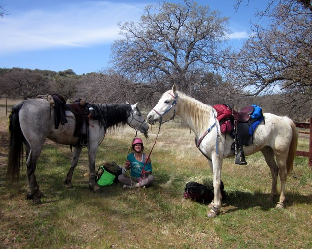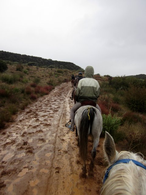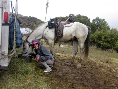 It was a slippery, soggy mess. Desire was as fired up as she had been on Friday and the slippery footing made that all the more unnerving. We came across two stuck pick up trucks and a pretty bitter ranch hand walking on the mucky road and slip slided our way by. The rain was on and off and Desire was being quite a jigging little nutter butter, so it wasn’t the most enjoyable situation. I jumped off and ditched the rain pants in a matter of miles because they were too baggy and kept riding up to my knees which didn’t make them very effective and was insanely annoying. We moved along dry river beds for a while and could do some trotting/jigging and a couple more pairs passed us, then we crossed under the highway and avoided some quicksand to cross a shallow stinky river and climb up for a nice long trot on a dirt road with nice footing. We ended up doing some slow cantering when the pounding pissed off trot became too much, and I’m not lying when I say I was cold, wet, and pretty irritated with my mare. Well, going back and forth between really irritated and pretty impressed. I didn’t know just how much fuel this mare had in her tank and now I do! She probably could have done all 3 days but I know that I couldn’t have taken another day in the sun with no shade on the trails. As miserable as the cold rainy windy day was today it was much more suited to our complexions!