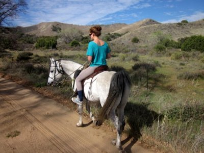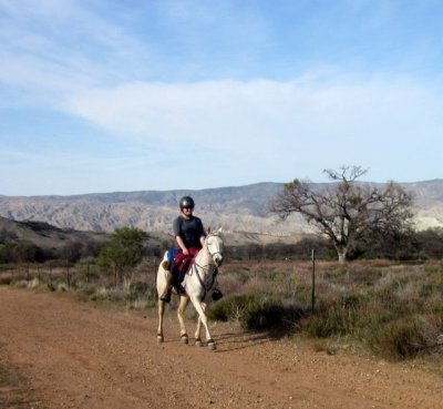 We had come into the lunch stop bunched into a group of 6 or 8 riders so just out of lunch there was a little passing and then A and I were settled into a quiet pocket again in no time. The trail got a little hairy for a few minutes, it was quite brushy and narrow and wound around, next to, and through a stream with big hoof+ sized rocks to go over. Desire was excited to go but was clever enough to realize this wasn’t the sort of ground to try to trot over so we picked our way through it successfully and then came around a corner and up a little hill to some wider dirt trails out in the open again. A was a little behind us and we trotted the flats and power walked the up hills, steep short little hills where I grabbed mane and got up off her back.