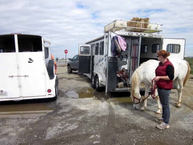 To begin from the beginning…We met A at the Hwy 20 and I-5 junction in Williams on Wednesday around noon. We were there 10 or so minutes before her and let the dogs and horse out for a walk about. It was breezy and chilly but that’s much preferable to straight up rain.