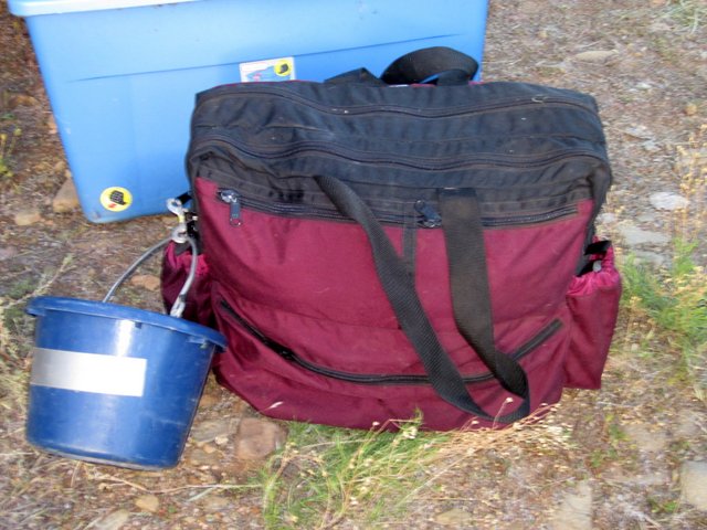 We vetted our horses in in the evening, which was of course very different than a regular AERC vetting in. I got to meet the infamous Duck at last, and the vet check was a gums check, skin tenting, gut sounds, and a trot out away, with an “Okay” from the Duck you were vetted in and good to go. No rider cards, we filled out our name and horse’s name on index cards at ride meeting and put them in a box as our official entry for riding the next day. On the back of the index cards was a little mock-up vet card with all the criteria filled in with As, lol. We got maps at ride dinner and I was a little unnerved when Duck said things like “after that, there’s no more ribbons, just go with it” but A assured me we would find our way. We dropped off our crew bags at the meeting, and that was my first use of my snazzy Snugpax crew bag that I’ve had for a year now, haha. I had filled it with alfalfa and grass flakes in the hay compartment, Desire’s cooler, more water bottles, duct tape and vet wrap, Ziplocs of two different kinds of grain, and some granola bars. I clipped my small bucket to one of the outside zippers, too.