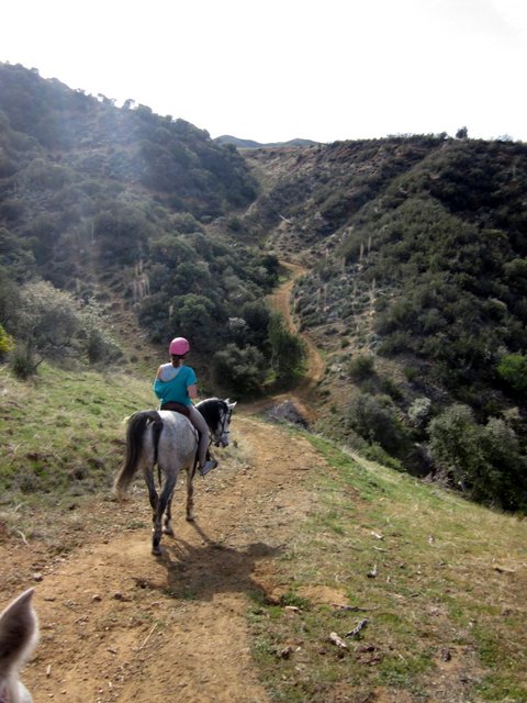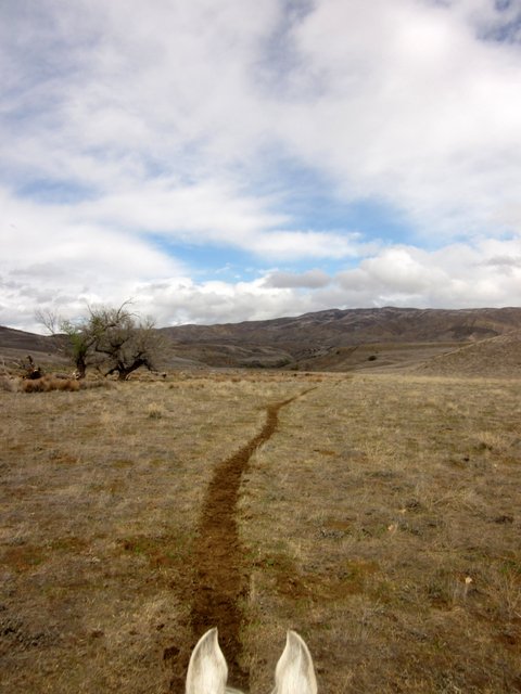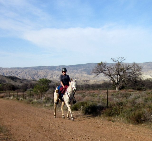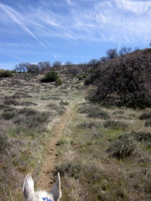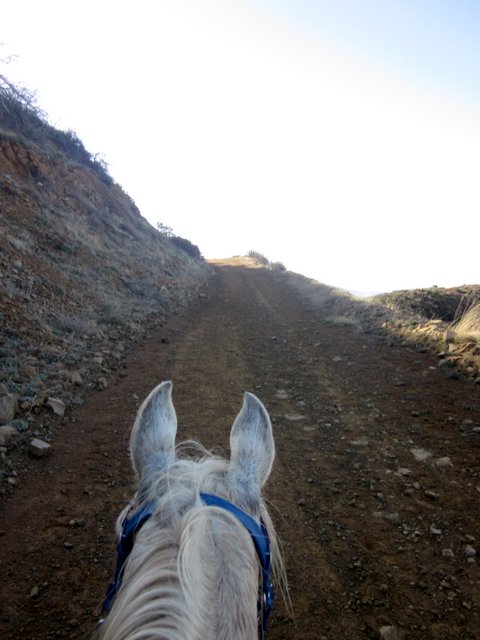 It was all I could do to keep her in a straight line as they trotted past, since she wanted to swing sideways which would have put her butt in the passing lane. Things were feeling a little dicey when a lady on a REALLY nutty horse came trotting/jigging/shimmying up behind us. The energy of the two horses clashed horribly and Desire was instantly worse. I turned her around to face back towards camp so she would see A and her stallion not far behind us, just in time to see the other jazzed horse as it started backing at speed up over the bank and through the rough ground behind it, then surged forward past us back to the trail and suddenly, where a broken sharp culvert and chunk of rusty fence went under and to the right of the trail, the horse just threw itself sideways off the trail and fell heavily, the woman riding him hitting the rocks and screaming bloody murder the whole way down. It was DRAMATIC. She quickly got up and apologized for screaming while her horse, a Mustang, trotted around loose at high speeds. A couple people moving out ahead of us stopped and blocked the way and there were 4 or 5 of us blocking the other way, and the horse was quickly caught. The lady led her horse back to camp and I guess that was that. A little disconcerting, to say the least.