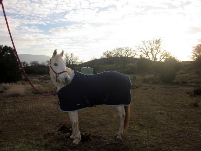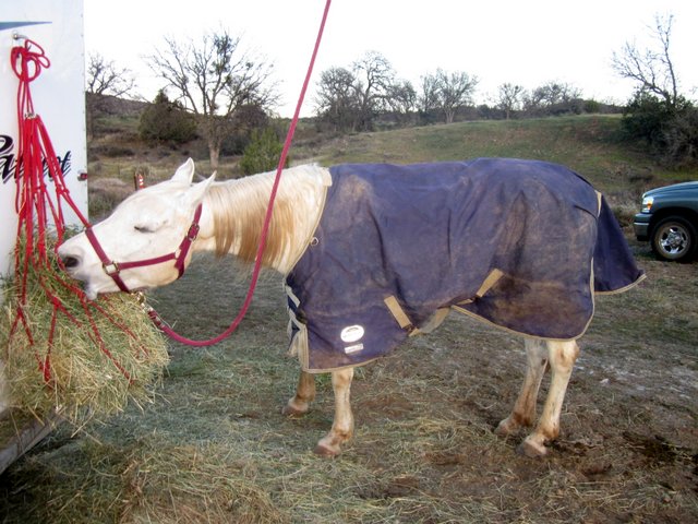 My cooler went out with my crew bag so Desire borrowed a sheet from Alamahn. What a ladylike bite of hay!