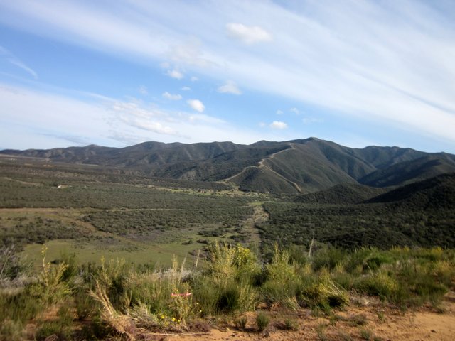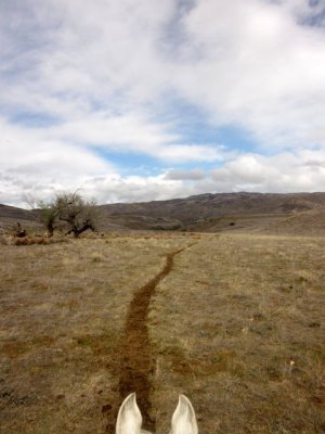 Desire started getting squirrelly suddenly and I looked back to see a guy on a paint coming for us at a good clip, so I chose a little hole in the bushes to tuck miss D into and he called thanks as he jammed by. I could see him off and on as we alternated climbing and descending in the wide open desert spaces, it was reassuring that I was on the right track though there weren’t really any confusing spots and all turns were well marked. I had the map but hadn’t needed to get it out at all. From that point on, probably about 28 miles out, it was just Desire and I for a while. A was behind us somewhere and the guy on the paint had disappeared in front. Desire was moving out really nicely, walking briskly and trotting whenever I even thought of asking her to. We wound around the hills for a while and then came down onto the flats again in sight of ride camp. Desire was pretty interested in the whole ride camp situation but the trail turned off to the east and we headed away from camp again.