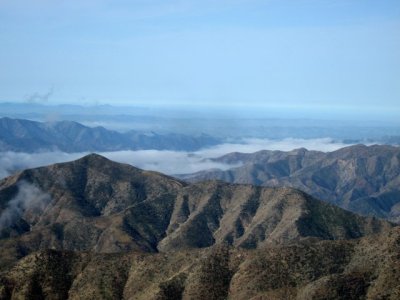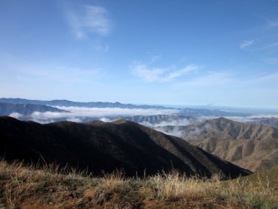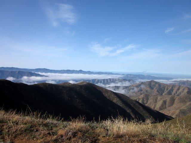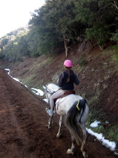 Desire and I had a pretty much non-stop battle up the mountain, she wanting to race everyone and everything in sight and me wanting her to take it easy up the hill, and trot out at around 8-9 mph on the flat spots. Far too rational a plan for miss mare, she jigged and sidled and was just generally a pain in the ass. One gal that passed us early in the morning on the trail said, “I’m sorry, been there!” as she rode past. I was definitely frustrated BUT it was so exciting to be at a ride, in my first 50, my first ride with Desire, there was lots to think about and see besides my silly mare. A was riding with us and we leap frogged with a few pairs up the mountain and finally out of the fog–there was even some tiny patches of snow on the climb!–to an awesome view: