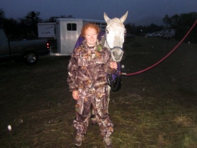 It got windy Saturday night and by early morning was raining pretty good. The rain kept starting and stopping, giving us hope that it wasn’t going to be too persistent. Unfortunately that wasn’t quite the case. I put on a long sleeve, polar fleece, breeches, sneakers, and my husband’s camo Frog Togg waterproof jacket and pants. Suuuper sexy! We tacked up in the rain and threw the waterproofs back over the horses as quickly as possible after the saddles were on. Desire was looking about as happy as a wet cat and had a definite cranky mare nose curl going on but was more than ready to get moving when it was time.