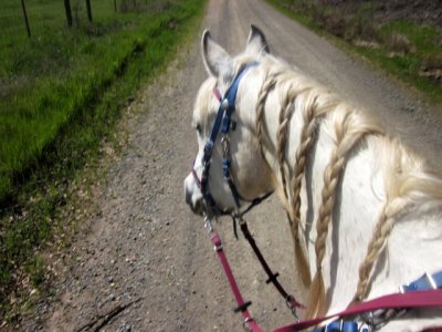 We had an exciting moment on the way back. We were trotting up a pretty steep short hill on the dirt road but were well over on the grassy shoulder, out of the road, and a car came around a blind turn. They were going slow and were well on their own side but Desire decided to slam on the brakes and start to surge right away from the car. My automatic bad-horse noise flew from my lips, a loud harsh “EH EH,” and it was enough to stop her surge so I could right myself and not hit the dirt. I was well over her left shoulder and clinging on her neck with my right arm and back with my right leg, so that instant she stopped at my correction was just enough for me to pull back into my seat and continue riding like nothing happened while the girls driving by gaped out the window at the almost-tumble. The balk was pretty unnecessary but she did listen and snap out of it and I didn’t come off, so I’ll call it a win-win. She was really good about listening to the EH EH today, whenever she started to get crazy eyes at a rock or stump I would voice it and she would straighten out and continue forward. Ooo so responsive, me so likey!
