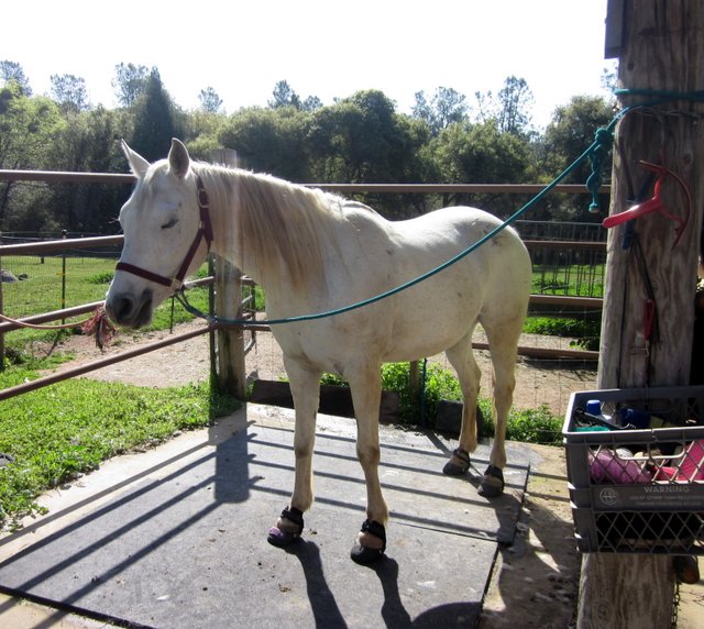 The photo below looks ordinary BUT it’s just simply not. Desire spends 98% of her time on the black mats in the cross ties tap dancing, stretching, leaning, just generally expressing her impatience and displeasure. Some combination of being ready to get going and hating black mats, as per her previous owners. So this photo, showing my wild endurance mare *snoozing* on the black mats, is simply priceless. She was so mellow that I got totally sidetracked and took a good 45 minutes to tack up while she just kicked it in the cross ties. A-M-A-Z-I-N-G!