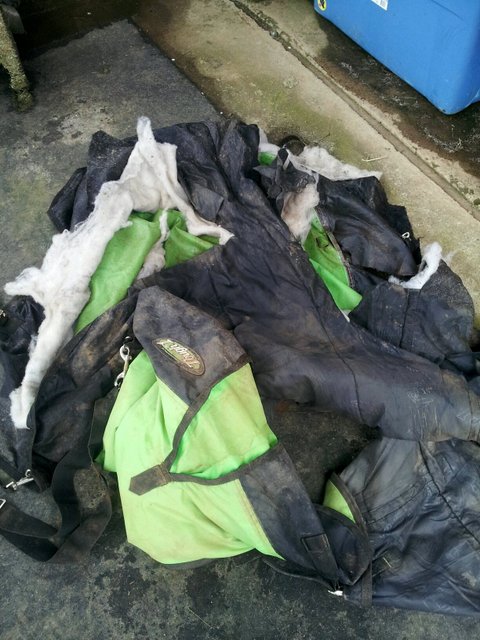 You can see from the photo above that he didn’t just snake his way out of it, shed it like an old skin, and leave it at that. I’d say there was rather a lot of stomping and biting going on after this blanket hit the ground. He wore blankets without issue in a sizable herd at his last owner’s, so I’m not sure what to conclude here. He’s bored? Had an official standing vendetta with the blanket after the Escapade? He knew it was a cheesy knock-off and wanted a Schneider’s blanket like everyone else? Or just knew green wasn’t his color.