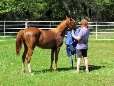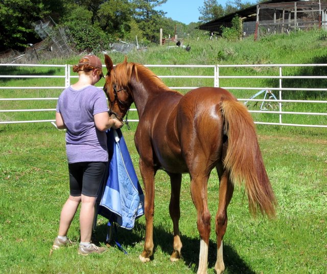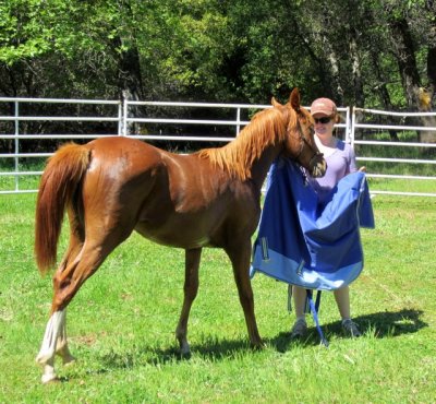 Despite the fact that it’s really warm here today and we’d both been working up a sweat for an hour just over the haltering issue, I decided to address the blanket issue. My greatest frustration in raising Sheza, my first foal, has been the regression thing. Sure, I haltered and handled her since day one, but some days she won’t be haltered. Sure, she wore multiple blankets from a few months old on up, but if it’s a new color she won’t wear it?!? Drives. Me. Crazy. SO, since the haltering was accomplished, I turned to the other regression, blankets.