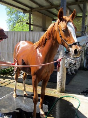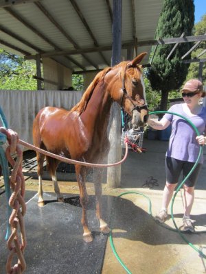 Okay, I know her head looks giant in the photo below but it cracks me up and I had to add it, the eyeballing she is giving the hose is SO Desire-esque. And it’s also photo evidence that my nutty filly can be sprayed off with a Terrifying Hose Creature and we can both live to tell the tale. Small victories, people, small victories.