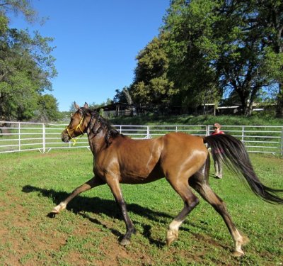 Joey didn’t believe me that I wanted him to stop and change directions first few circuits around the pen and instead of yielding to my upraised hand as he has been doing, he charged for the gap between me stepping to forward to block his intended path and the panels, and took a Lipizzaner leap at the pen itself, crashing into it. It was lightning fast, loud, and dramatic. One round pen panel bent and the whole pen pushed out a good 10 feet. He scraped his left front and cut his left hind, but not badly, not ouchy, and so we worked. And worked.