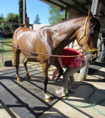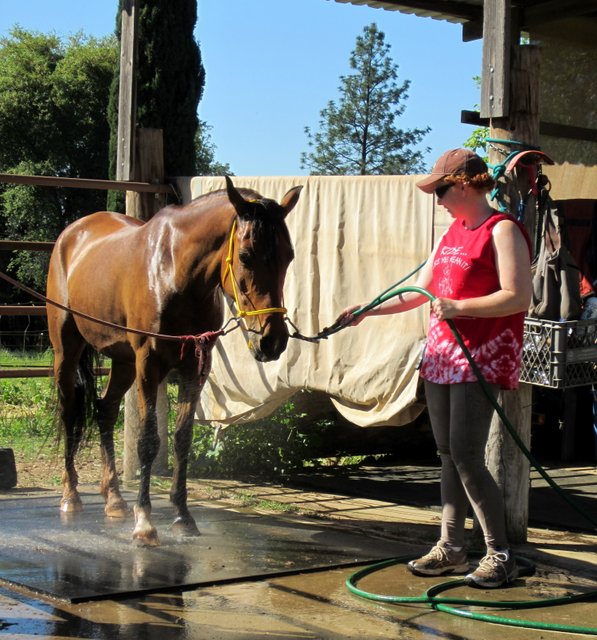 I put Trail-Rite’s Magical Ointment on the scraped front leg and cleaned and sprayed Vetericyn on the small cut on his hind. He also got fly spray all over which he was fine with.