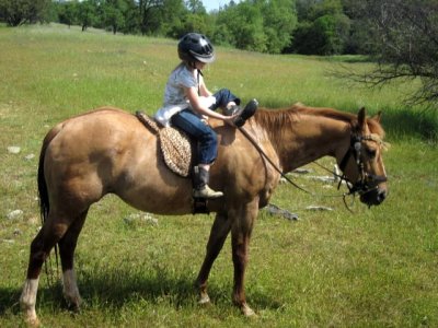 Last time I saw little T she wasn’t too keen on the whole horse situation, she would participate some but wasn’t horse-crazy like her mom had been hoping. What a difference a  year makes! As I mentioned T was riding Emmy in just a bareback pad today, and has become a real little cowgirl. Emmy is a really smooth nice horse but has a bit of a mare opinion at times, but T did really well with her and we walked, trotted, and cantered on the “private” trails. At a snack break we were all dismounted relaxing and D said, “Hey T, show her your trick.”  I had no idea what to expect as T put her hand low, Emmy dropped her head to her hand, T grabbed Emmy’s neck just behind her head in a bear hug and Emmy *tossed* T up over her neck and onto her back. Then T turned around to face the right way, Ta Da! It was a *slick* trick and I so wasn’t expecting it.