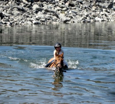 The connector of the loop was underwater and T was dead set on getting in there, so in she went! D joined her but Blaze was content to graze on the shore and play photographer’s mount.