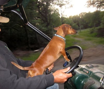 Wilbur wiener has the need, the need for speed! He ran and ran and ran and ran up the hill until his little stumpy legs couldn’t run anymore, and then joined my husband in the driver’s seat: