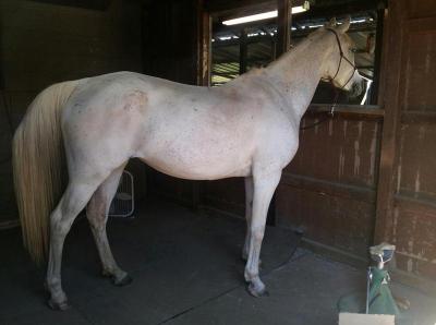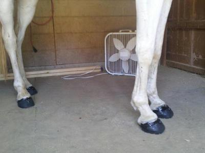 And hopefully, that won’t turn into “Houston, we have a problem.” Trailered Desire down to my trimmer’s, D’s, this morning for a fresh trim and the Glove Glue-on application. It went pretty smoothly overall, though the left front Glue-on went on a little funky and we had to have a second go at it.  D rasped the dried glue off her hoof wall and reapplied it, but then Desire put her hoof back down she slightly twisted right at the end as the glue was already setting, so there is the slightest twist to the left front boot…if any come off it will probably be that one, but there is some small slight chance NONE of them will come off..what a thought..we’ll see. I’ll be carrying Gloves and tape on board, that’s for sure.