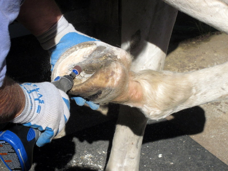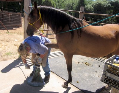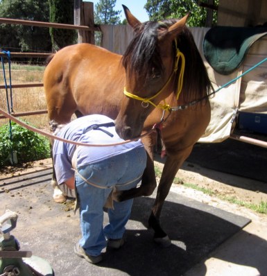 You can see by his expression he is not entirely thrilled by his hoof disappearing between her knees, but he stood for it!