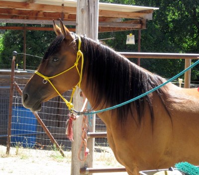 AND, today he had his first hooves-between-the-knees moments and first work with the nippers. Up until now D just got a few swipes of the rasp on each front, but today both fronts were up and nipped and rasped a little. When he started to get shuffley we backed off, happy with his progress. She also got a little nipping done on his left hind but she did’t want to take too much to unbalance him since we knew she couldn’t do much to his right hind. Sure enough when she went to his right hind his head went up and he tried to scoot away. We didn’t push it much beyond handling the leg itself and called it a day. Much better than when he arrived and we could barely run hands down *any* of his legs!