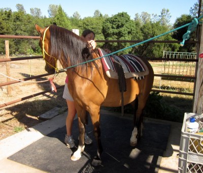Sure enough, B got him to do one more nice walk off , only 5 or 6 steps, with his head held nicely and she said “There, that’s it, done.” She felt the same thing from him that I did and called it on a small triumph, again something I believe is so important for a sensitive guy like Joey. He gets incrementally better at things every single time he is handled and there is just no need to push him beyond his limits. He came to me in March only halter broke, first time in a trailer, first time off the place he was born, at 6 years old– it’s really quite amazing how far he has come in a few short months! I really appreciate B and her teachings.