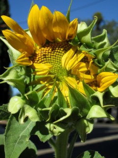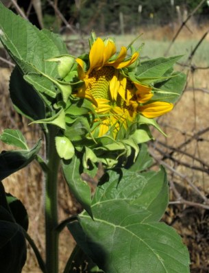 This is a volunteer Sunflower that decided to grow down near our front gate, on my Polaris feeding route. I’ve been dumping mash-pan loads of water on it every day as I drive by. Today it popped it’s first petals open: