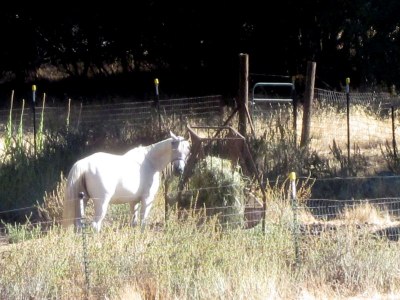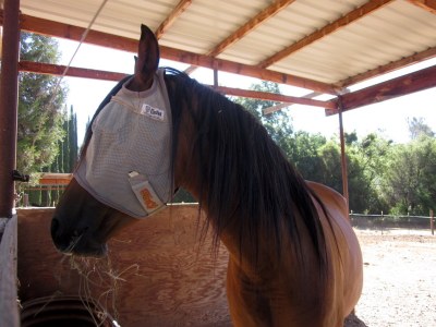 Joey didn’t have a session with the trainer last week due to scheduling, so I’m planning to have her come this Thursday even though it’s the evening before we leave for Gold Country. Joey is doing really well and I want to see him to continue to realize his potential. In the meantime he has been dozing in his fly mask and stuffing his face..and he is still a little unsure about all of the strange behaviors his humans exhibit.