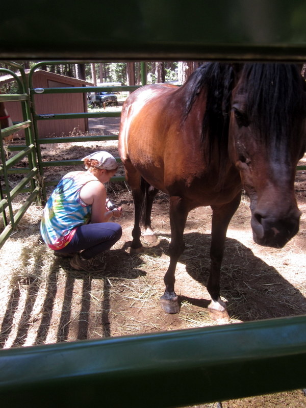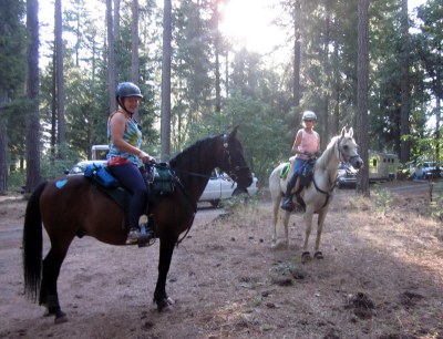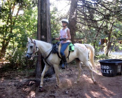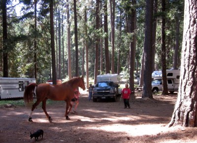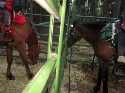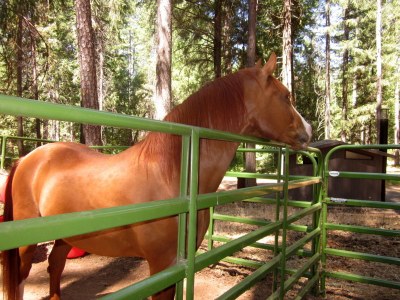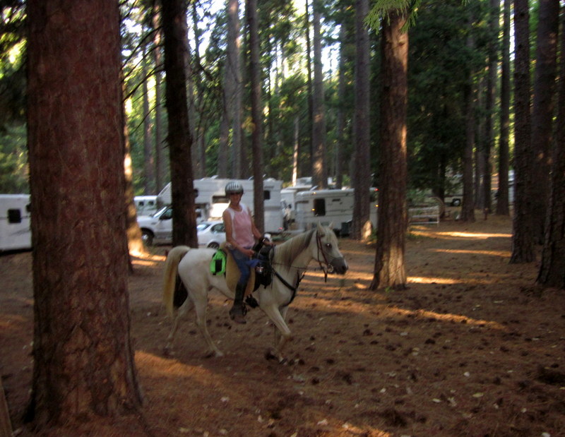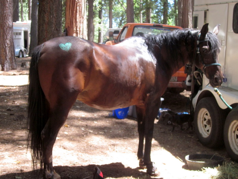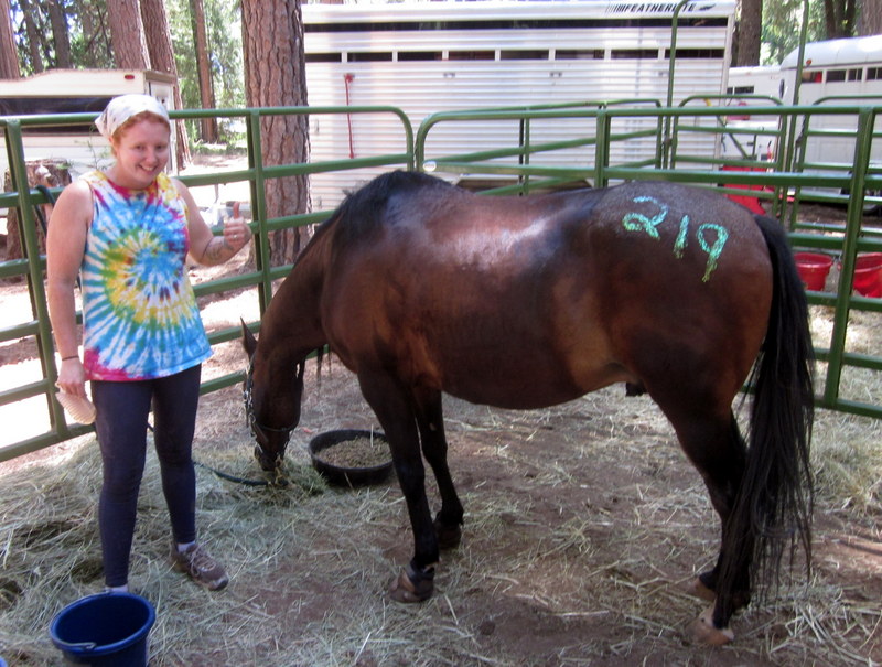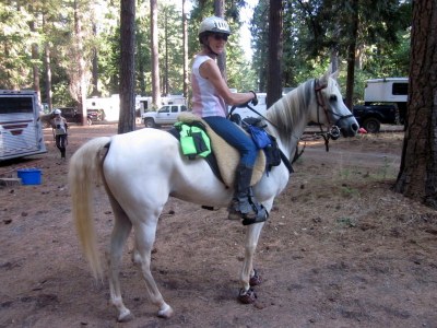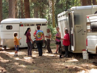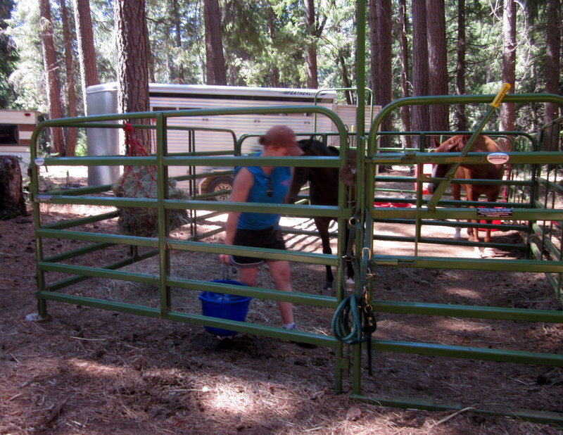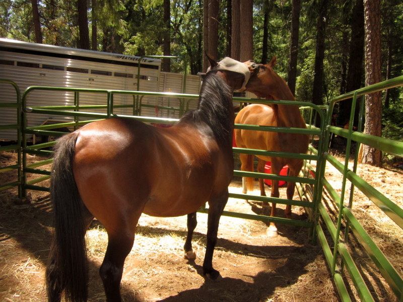 It was 90 miles from our door to ride camp. The drive was quite easy from our place to Auburn and then sent me back to childhood with the hairpin turns on the 49. A very windy but relatively short bit of road and before we knew it we found camp! The people at check in directed me to my camping spot next to D, my hoof care expert, who brought her home bred Arabian, Launi, for his first LD. She was majorly nice enough to speak up for me so when we got there we found not only friendly faces to camp next to, but a sturdy, empty horse camp corral for Blaze! Such luxury since my mounts are generally quite unglamorously tied to my 2 horse Miley at rides. The corrals were permanently installed and part of the very nice horse camp setting, there were a few scattered around camp but not many and it was very nice of D to save us one.