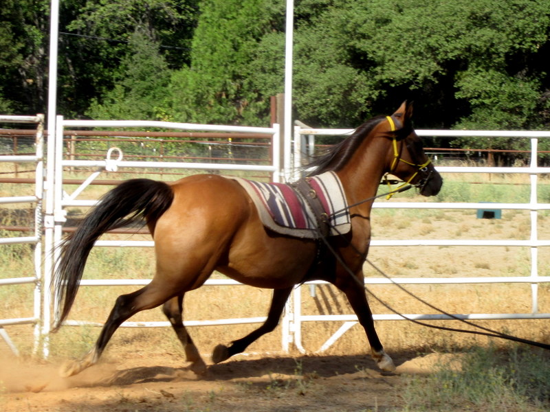 Joey’s go to move is, predictably, to flee. Of course horses are flight animals, but Joey has also been low man in the herd for much of his life until he came here 4 months ago, so he is very practiced at fleeing–he had to flee so he didn’t get his little behind whooped! When B started with him it was all trotting, much of it nervous, high headed, and if we got a step of walk we were beyond happy. Today was just so different! Joey was very in tune to B and when he did become uncomfortable, while he would squirt away into a brisk trot, he would stop himself in a matter of a few steps to look/tune in/ask what’s next. Even when B started shuffling her feet, akin to the bunny hop, a suspicious human activity which prompted a panic high speed trot, after about 10 circuits he was stopping to stare, trotting, stopping to stare, and then deciding he wasn’t maybe so scared or impressed by that anymore. He was much more into thinking, investigating. asking, and giving–than fleeing. Huzzah!