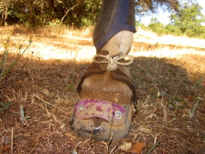 After crossing the water my boots were thoroughly soaked and squelchy and I took off at a high power trot to see if they’d stay on. I stopped to check them and noticed the flapping gaiter, so the leather string came into play and held it closed wonderfully the rest of the ride. There’s tape under all that filth on her hoof, too.