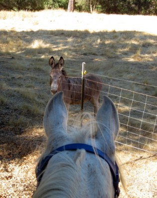 Desire vs. hilarious donkey creature: Stare Down Round 1 of 7. The donkey kept running and bucking along the fence line next to us and it was blowing Desire’s mind