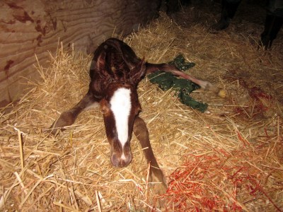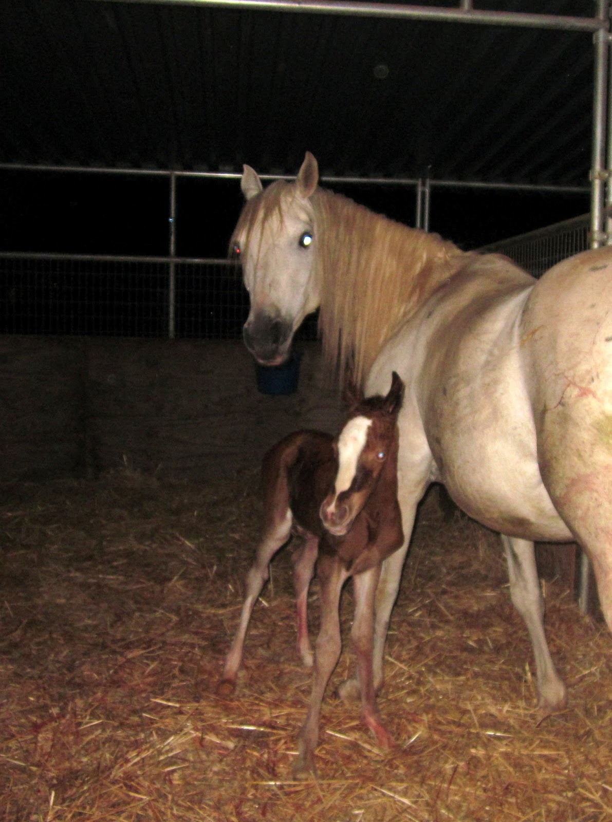 We got know each other over the next 3 1/2 months and then, at 11 pm on April 14th, 2011, Sheza Blazunhaat Xpres was born in the corner stall of our little barn. I found Desire with Sheza’s forelegs just popping out and my husband and I helped deliver the filly and wiped her off: