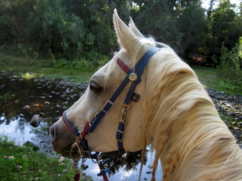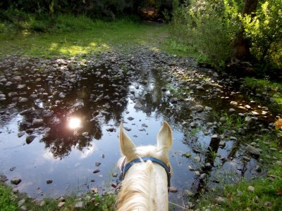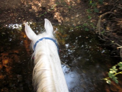 After power trotting away from the water, cantering and powering up a long, steep hill, and descending: ALL FOUR BOOTS!