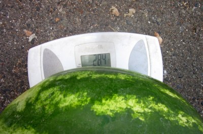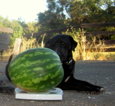 80 lb Lax mix, Tady, is hidden behind a big melon!