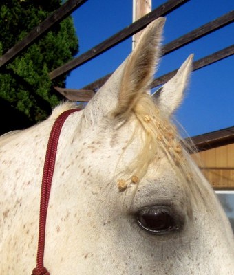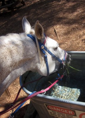 It was about 95 degrees by the time we were heading back to the trailer, pretty warm after enjoying a few days in the 80s. My back adjustment, Arabian style, came within about a mile of the trailer, headed back. We trotted up the last hill nice and loose and then right at the top Desire saw a rock in the bushes on her left, slammed on the brakes and jumped about 5 feet to the right, all in one go. Back, consider yourself adjusted! Or un-adjusted, as the case may be.