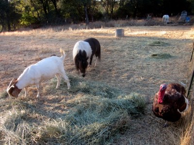 We had to bury one of our SuperTurkeys, Clark, yesterday. Now we have a solo SuperTurkey, Lex. Here he hangs out with 5 month old Count Hector Goatula and mini (emperor) Napoleon at evening feeding time