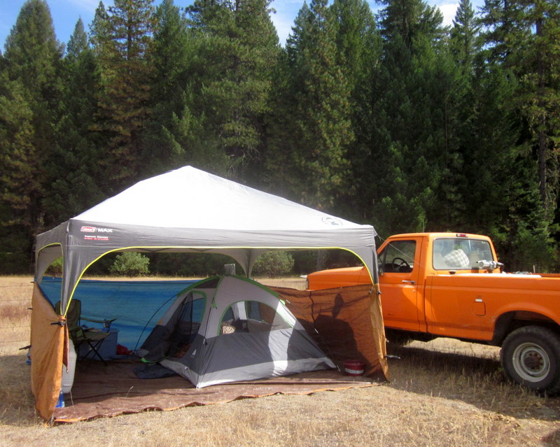 My faithful Bomber treated me to ice cold a/c and all systems go for the whole long, warm, slow 5 hour drive. Bless it’s orange self. Ride camp was easy to find, there were signs and ribbons on the road and the big open field for ride camp with rigs was clearly visible. There were 8 or so rigs already there but the field was quite large and never did fill up. I pulled nose in to the barbed wire near the far end of the field and set up the Arabian Nights tent, hot open field edition: